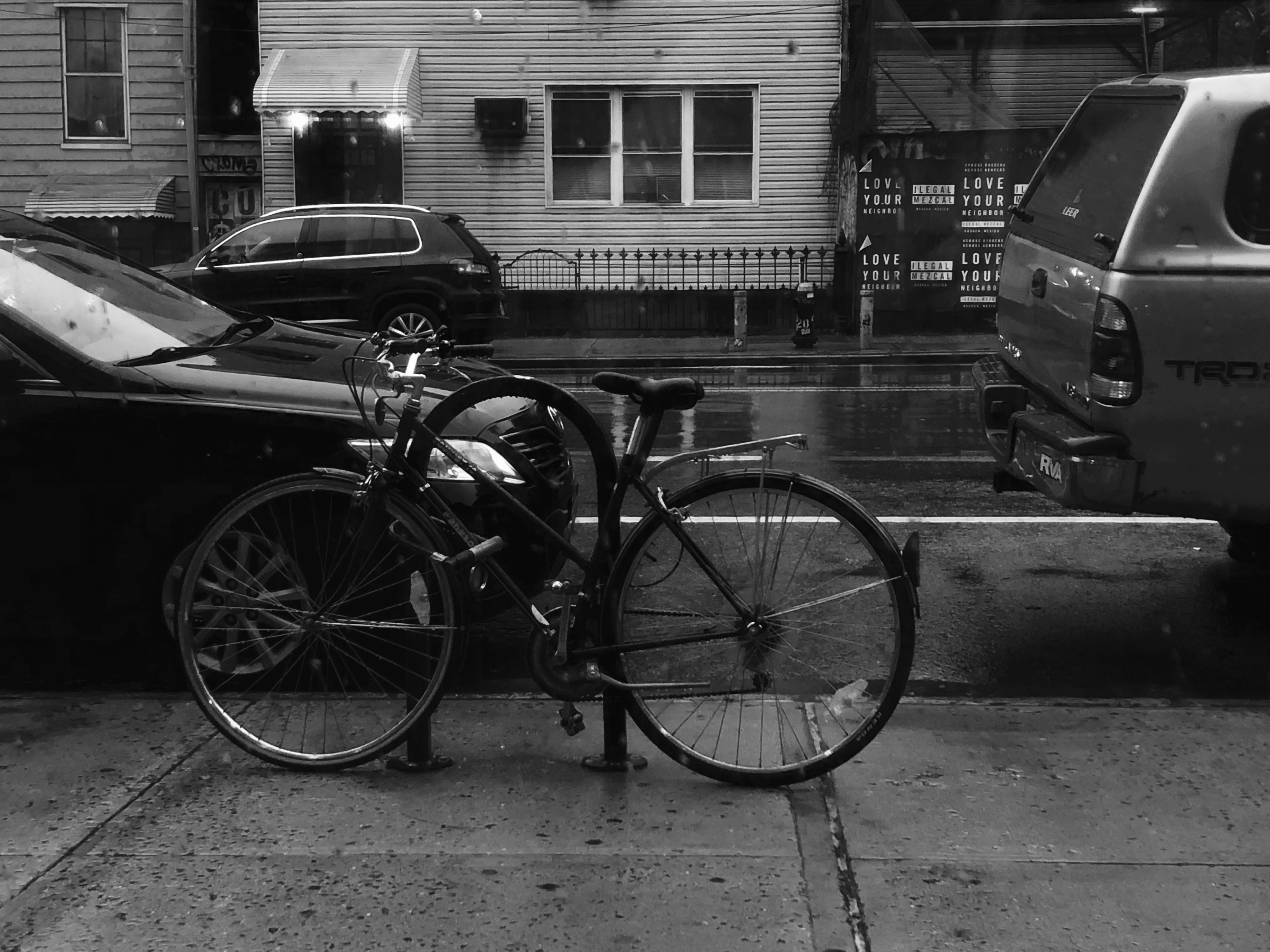 By the time the sun was supposed to be making it’s decent into the earths crest, the ground had already been created into a reflective surface. Rain slowly and patiently falls from the grey overcast sky. Headlights of cars beamed toward the puddle filled concrete causing a glimmer of reflection. A still image in time sits waiting to be maneuvered again. Made for movement, now locked tight against a black painted upside down metal U attached to the ground. Rusted with age and exploration, the two wheels stood still, soaked in water droplets from the clouds cold tears. Each droplet dripping with the wind. One after the other free falling from the metal surface to the earths hard ground. Then finally finding a crease in the wet sidewalk, before drifting off into the puddle that sat close by.